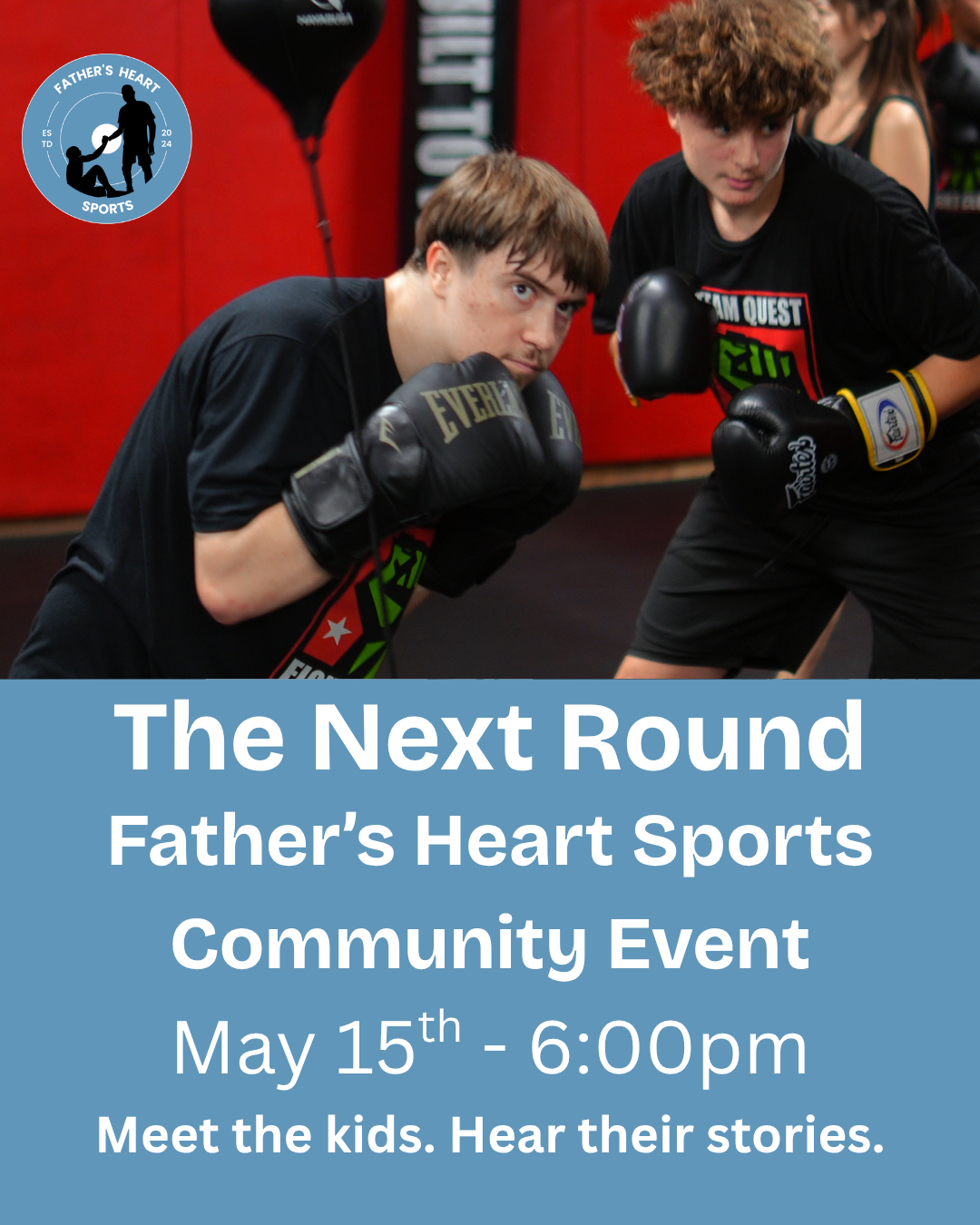 On May 15th at 6:00 PM, Father’s Heart Sports invites you to The Next Round—our second Community Impact Event, hosted at Team Quest Martial Arts in Portland.
